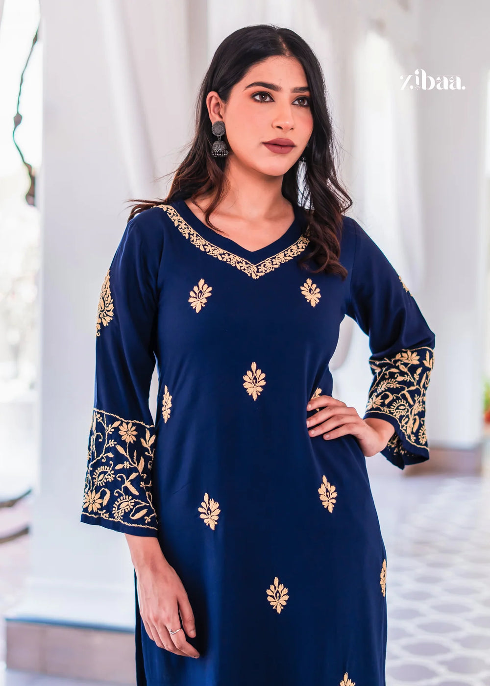 Hoor Blue & Gold Luxury Rayon Chikankari Kurta