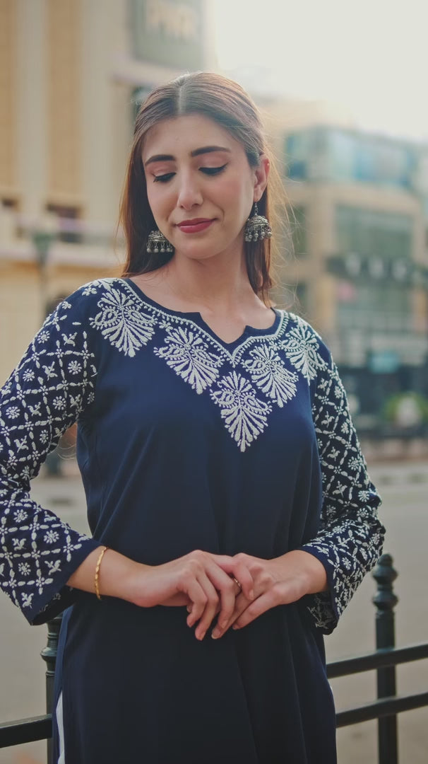 Our Maaya Modal Blue Chikankari Kurti with Jaal work is pure dream. This kurti will make you stand out of the crowd with its intricate floral embroidery on the neck and entire sleeves. The Jaal work is one of the most methodical and time consuming work of Chikankari art. Each karigar spends hours in perfecting each detail of this thread work to maintain the consistency and unique look. The feel of the premium quality rayon fabric is soft and slight heavy which makes it a perfect outfit for all seasons.