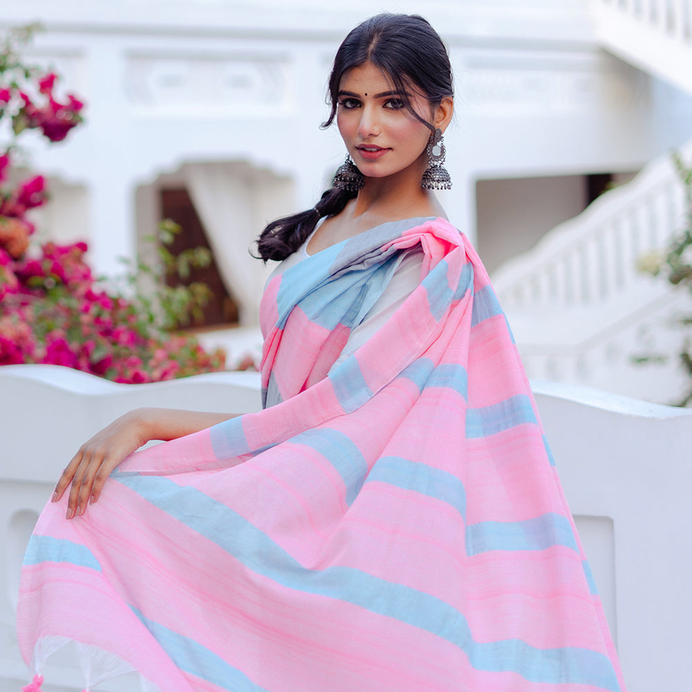 Mira Hand-Dyed Mul Cotton Striped Saree with Tassels
