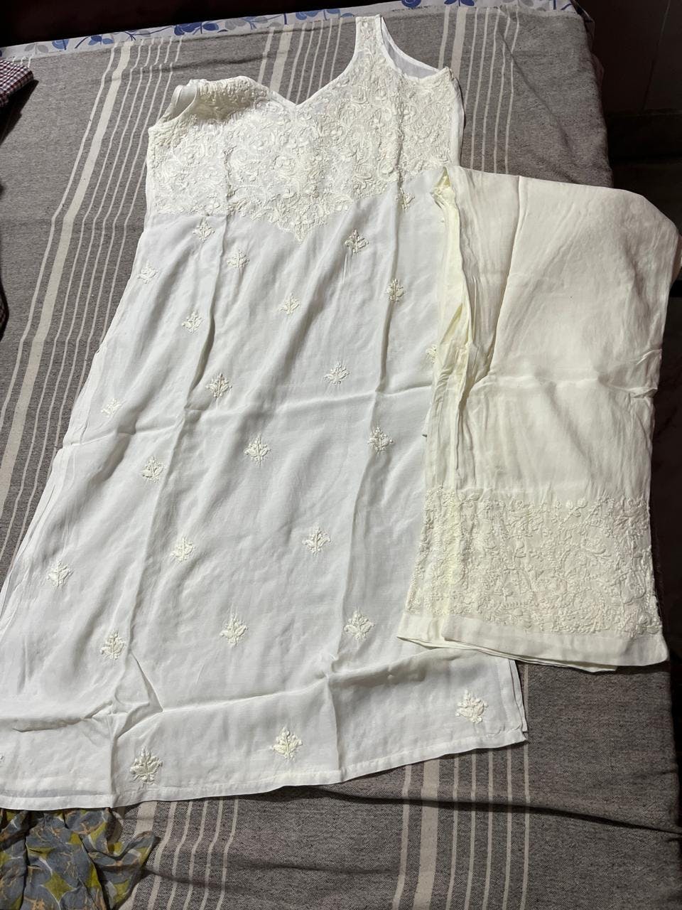 The sleeveless ivory kurta paired with coordinated trousers gives this set a refined, minimalist elegance. The delicate muslin fabric embroidered with lovely Chikankari motifs in a matching ivory thread makes this a lightweight ensemble perfect for hot Indian summers.