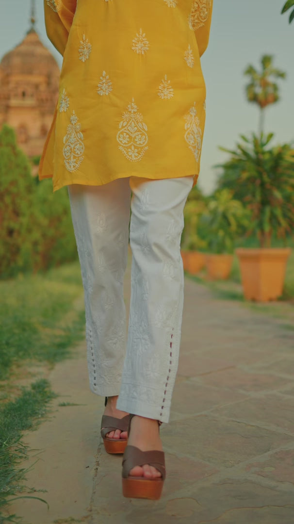 Pair these classic white hand-embroidered pants with any kurti to take the overall look up by a notch. This pair of unique trousers has an elasticated waist and straight-cut hems with floral embroidery details details at the bottom of the trousers.